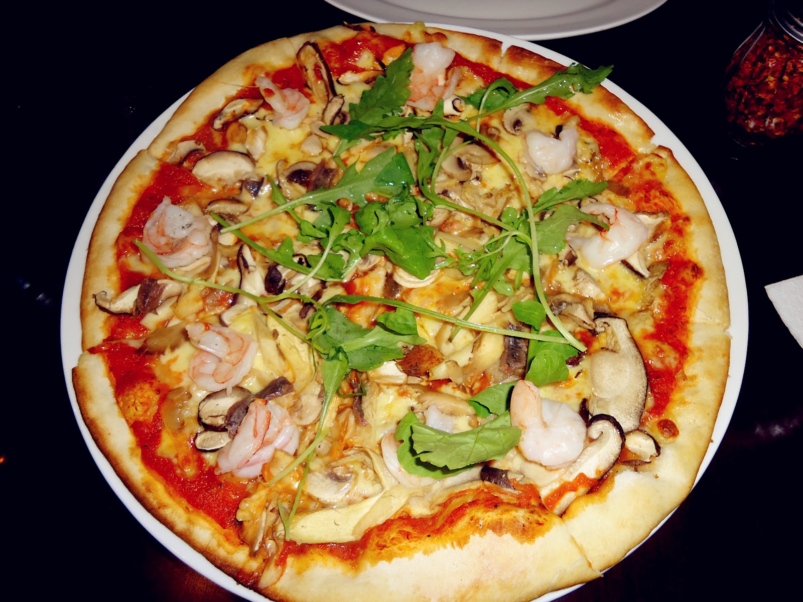 Shrimps, achovies, mushrooms, mozzarella and Asiago cheeses.