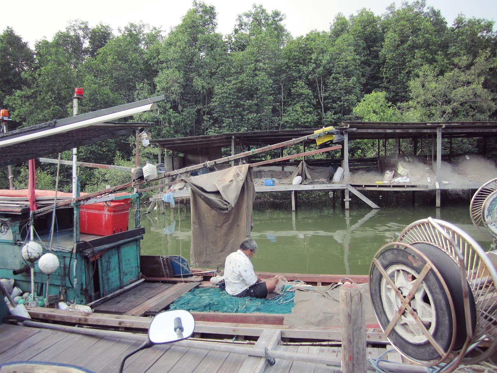 看不见其他渔夫的踪影,当时只有一位肤色黝黑的老渔夫平静地坐在战船上修补着自己的渔网。这画面有如小时候画的画。