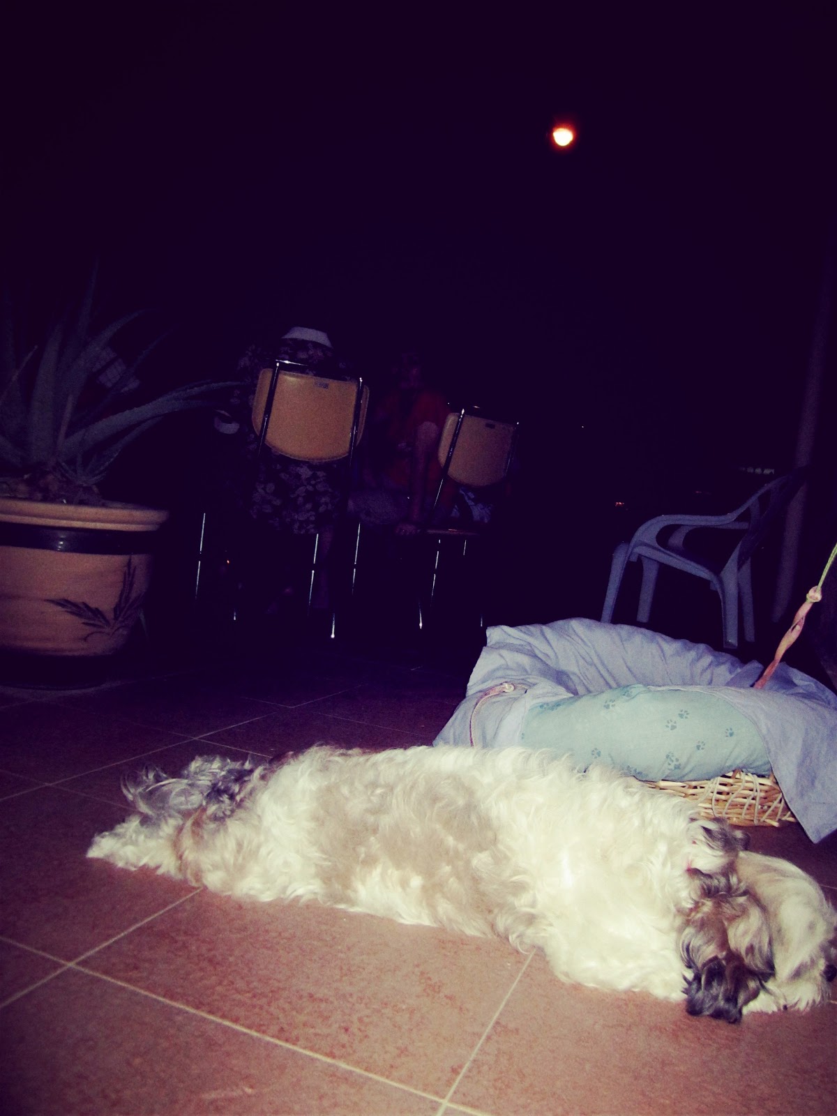 睡美狗在外头赏月还有自家的床。可爱又幸福♥